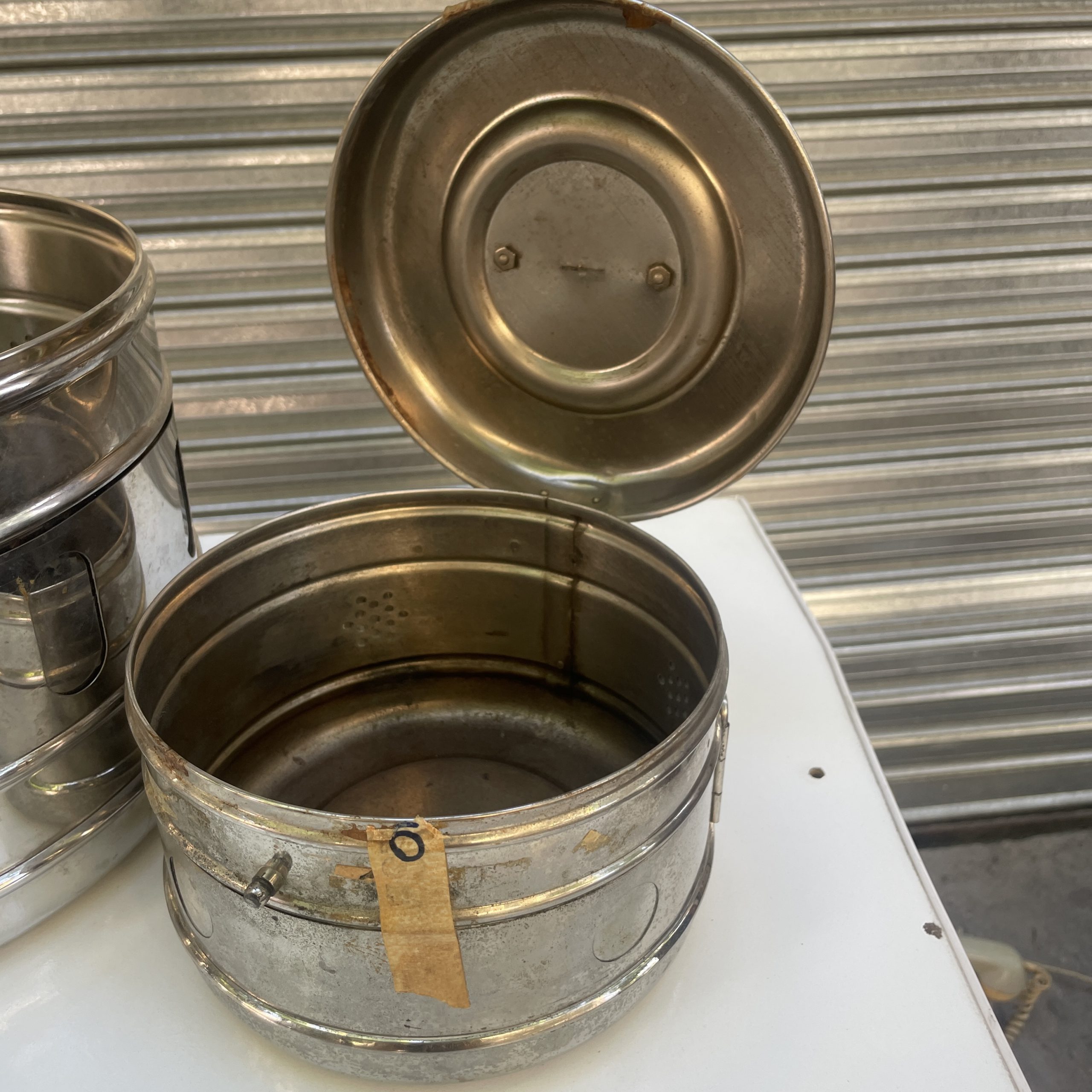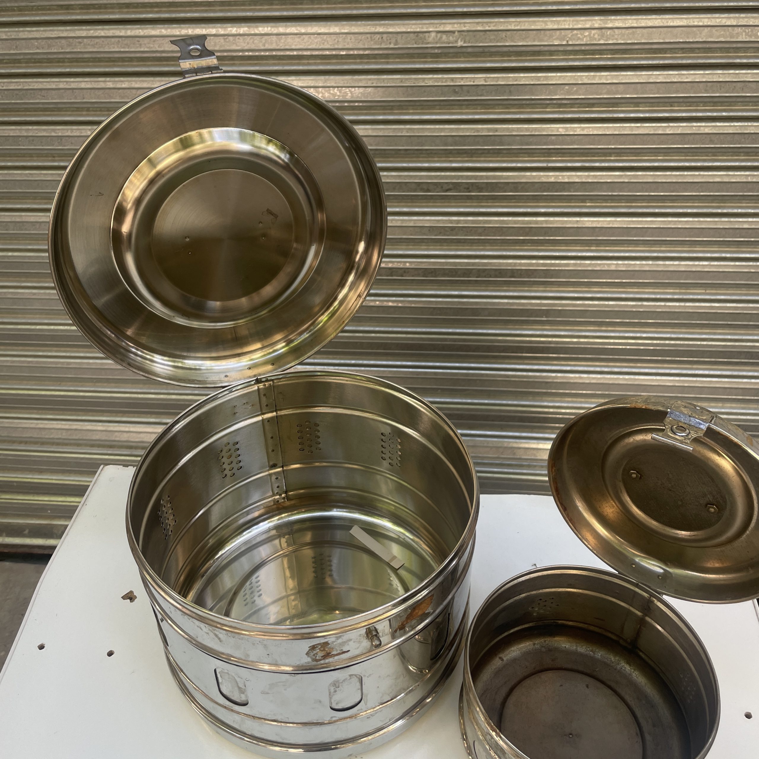 tambor para esterilizar material quirúrjico. de acero inoxidable. dos disponibles: uno grande y otro más pequeño